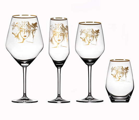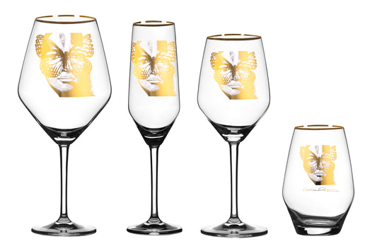 Glas som lyfter varje tillfälle med en känsla av konstnärlig elegans. Varje glas är designat med hennes ikoniska motiv, inspirerade av de kvinnor och upplevelser som har format hennes konstnärliga uttryck. Fjärilen, som symboliserar frihet och transformation, är ett återkommande signum i många av Carolinas verk.